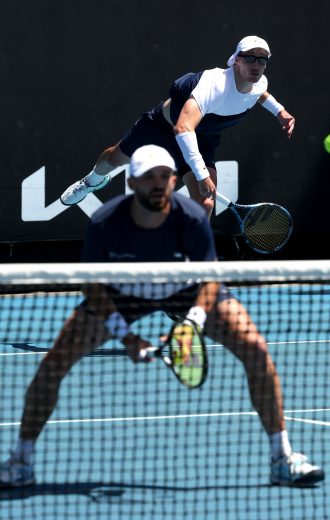 January 15: Marc Polmans (AUS) and Matthew Romios (AUS) during their doubles match in round 1 of the Australian Open on MCA at Melbourne Park on Wednesday, January 15, 2025. Photo by TENNIS AUSTRALIA/ JAY TOWN