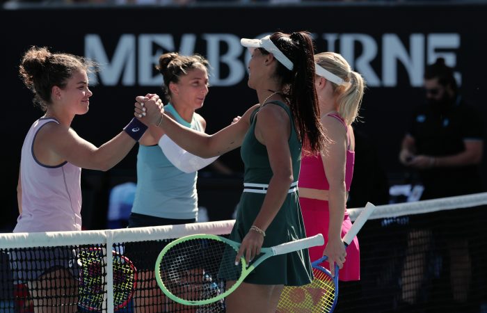 January 17: Priscilla Hon (AUS) and Daria Saville (AUS) with Sarra Errani (ITA) and Jasmine Paolini (ITA) during Round 1 doubles on Court 3 at the Australian Open at Melbourne Park on Friday, January 17, 2025. Photo by TENNIS AUSTRALIA/ MARK PETERSON