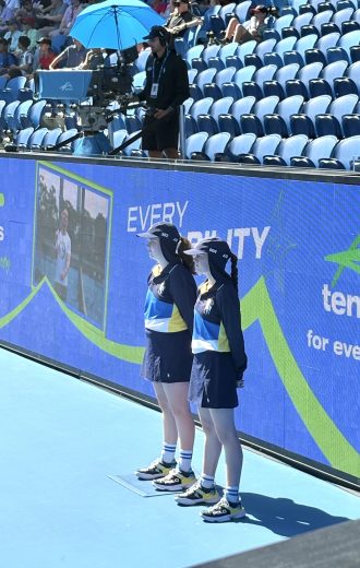 This memorable match was a standout of the day. Seeing Adelaide and Remi on court, enjoying themselves and playing a vital role in the successful running of our home slam, highlights the importance of inclusion initiatives. They open doors for kids of all abilities to be part of the AO experience and showcase their skills and contributions on the world stage. Refer to the photos below to see Adelaide and Remi in action during the All-Abilities match!