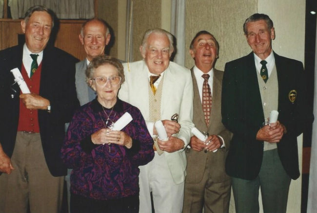 Image: Left to right > Tennis Seniors 40th Anniversary Dinner Graham Bartlett, Leo Lonergan, Jean Manning, Arthur Brown, Bob Thornton and Harry Gibbs