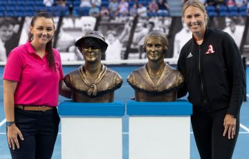 COVID-19 restrictions prevented Mary Reitano from attending the ceremony on Rod Laver Arena, but her statue, sculpted in bronze by Barbara McLean, will join the others greats of Australian tennis on permanent display at Melbourne Park.