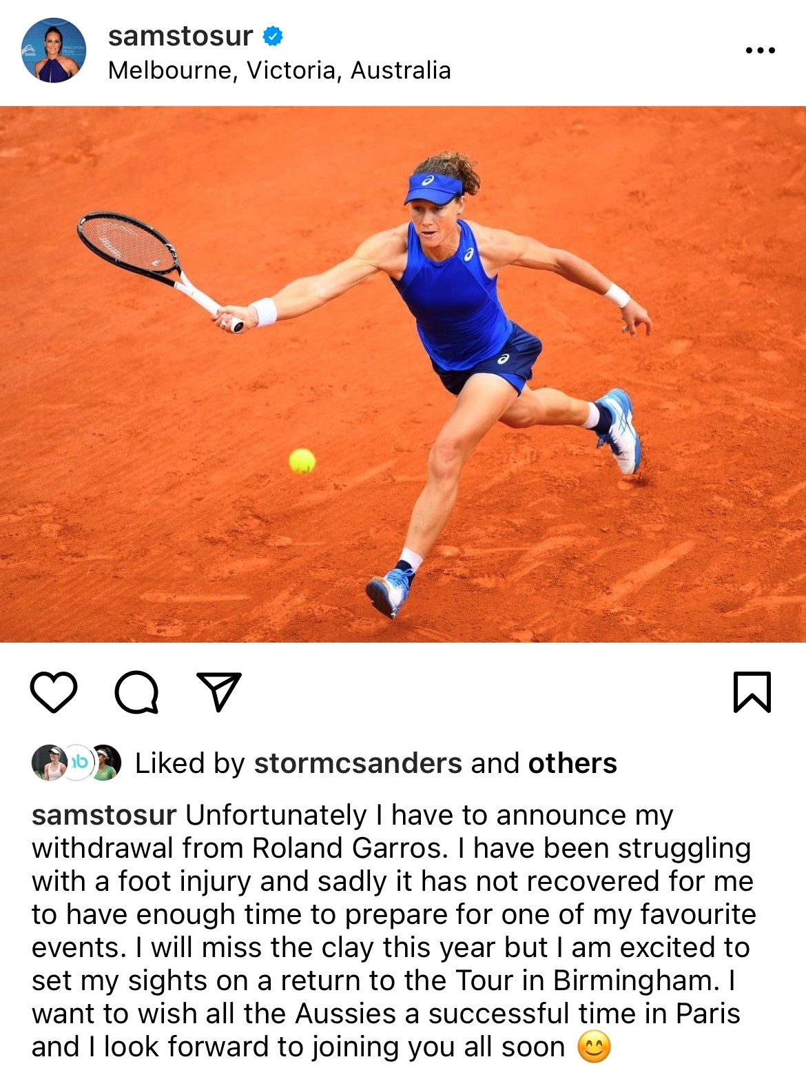 Sam Stosur won't compete at Roland Garros this year - but she plans to be back on tour shortly after.