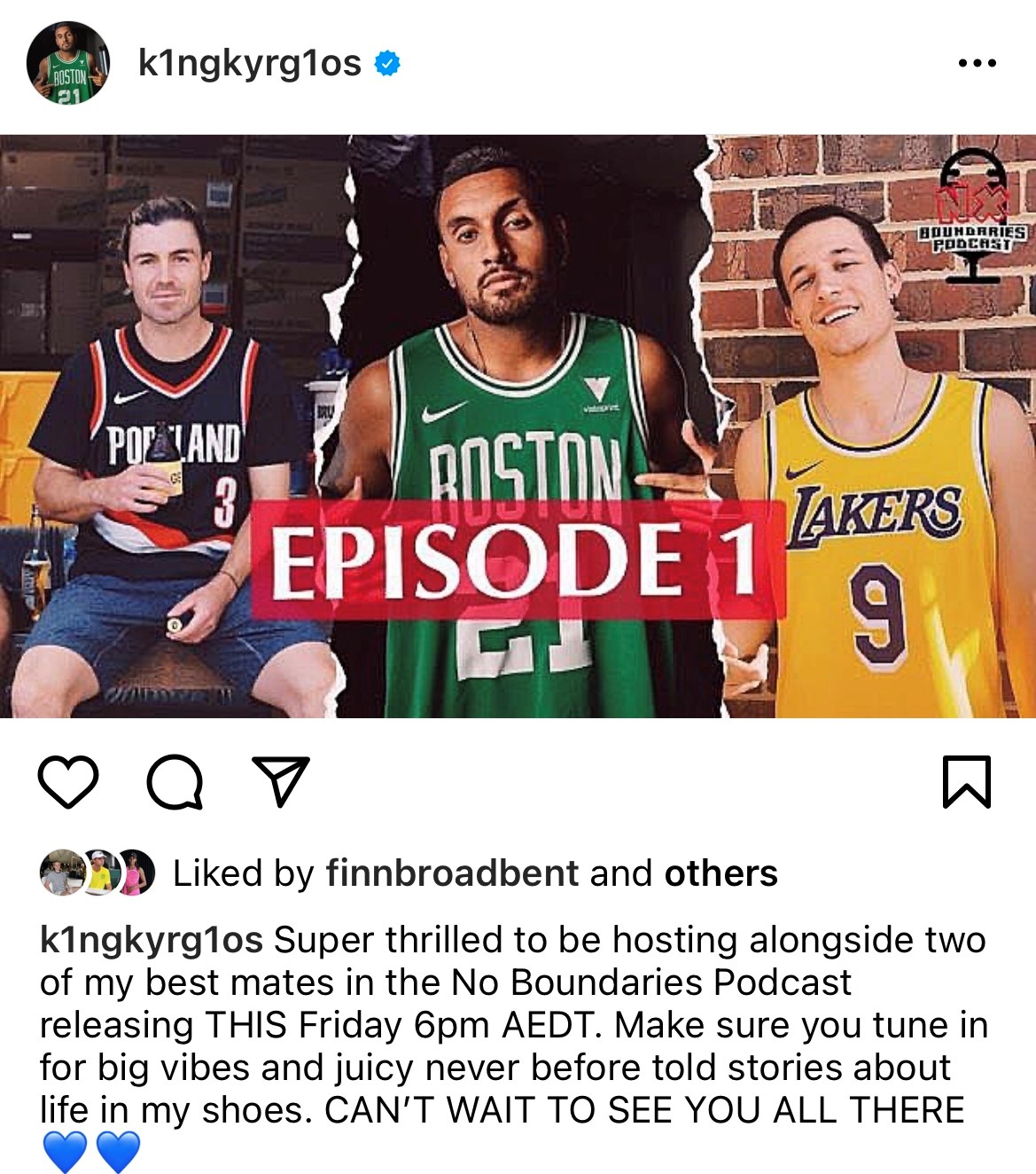 Nick Kyrgios is using his time off tour to watch a lot of basketball and release a podcast: