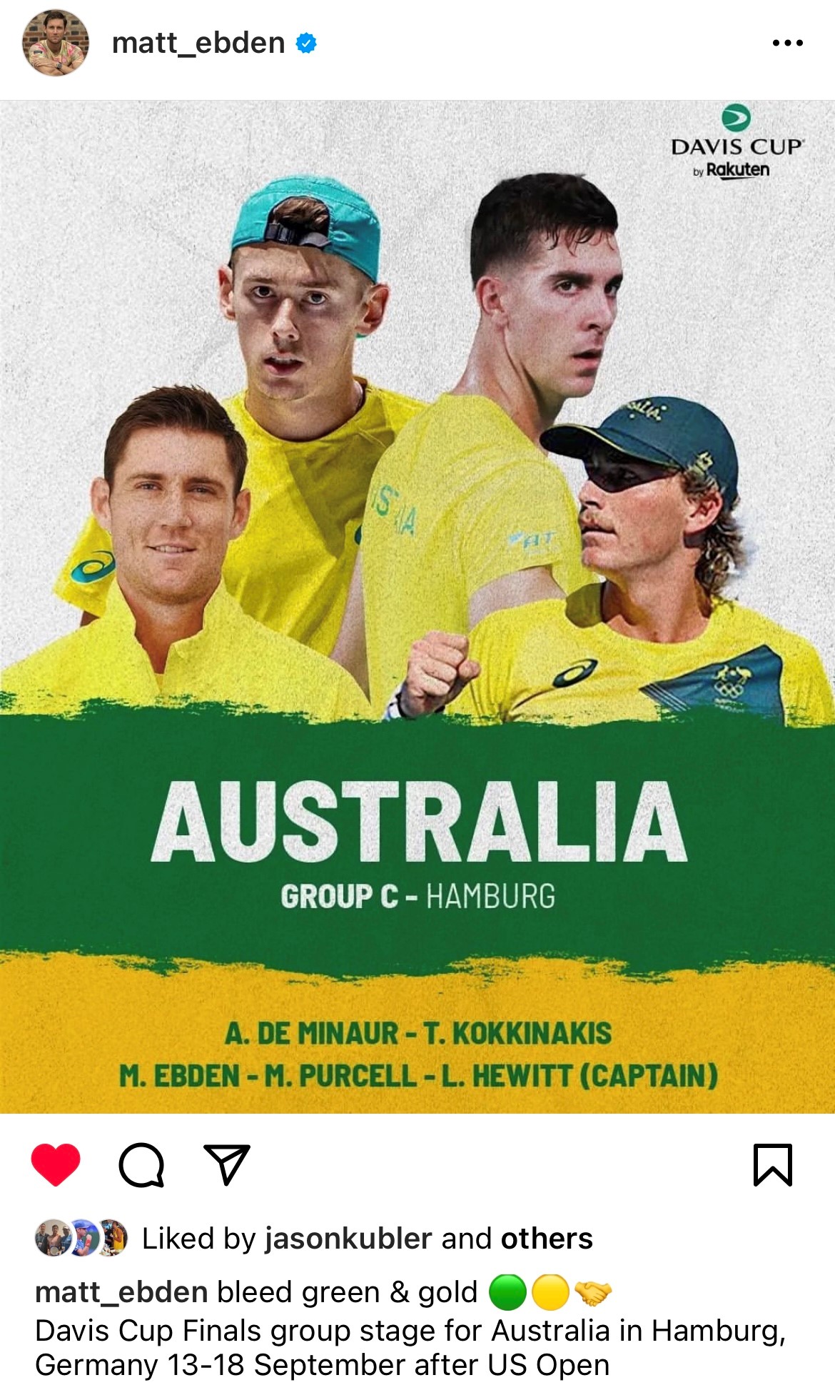 Alex de Minaur and Thanasi Kokkinakis will spearhead the Australian team for the Davis Cup Finals group stage next month. Max Purcell is also set to make his Davis Cup debut, while Matt Ebden is excited to be recalled to the team for the first time since 2018: