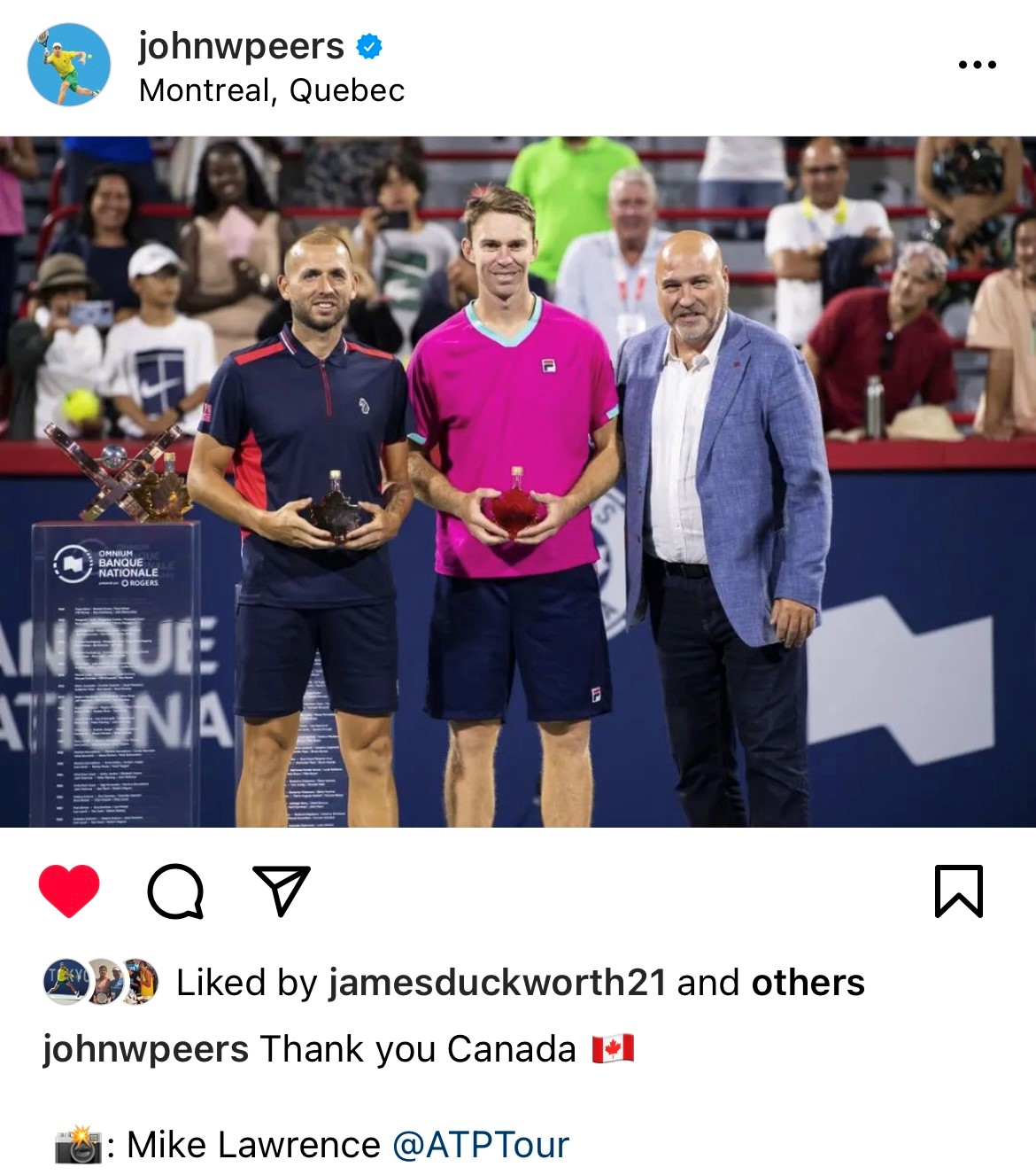 John Peers was a men's doubles finalist alongside Brit Dan Evans in Montreal. It was the 34-year-old's sixth career final at ATP Masters 1000 level and propels him back inside the world's top 10: