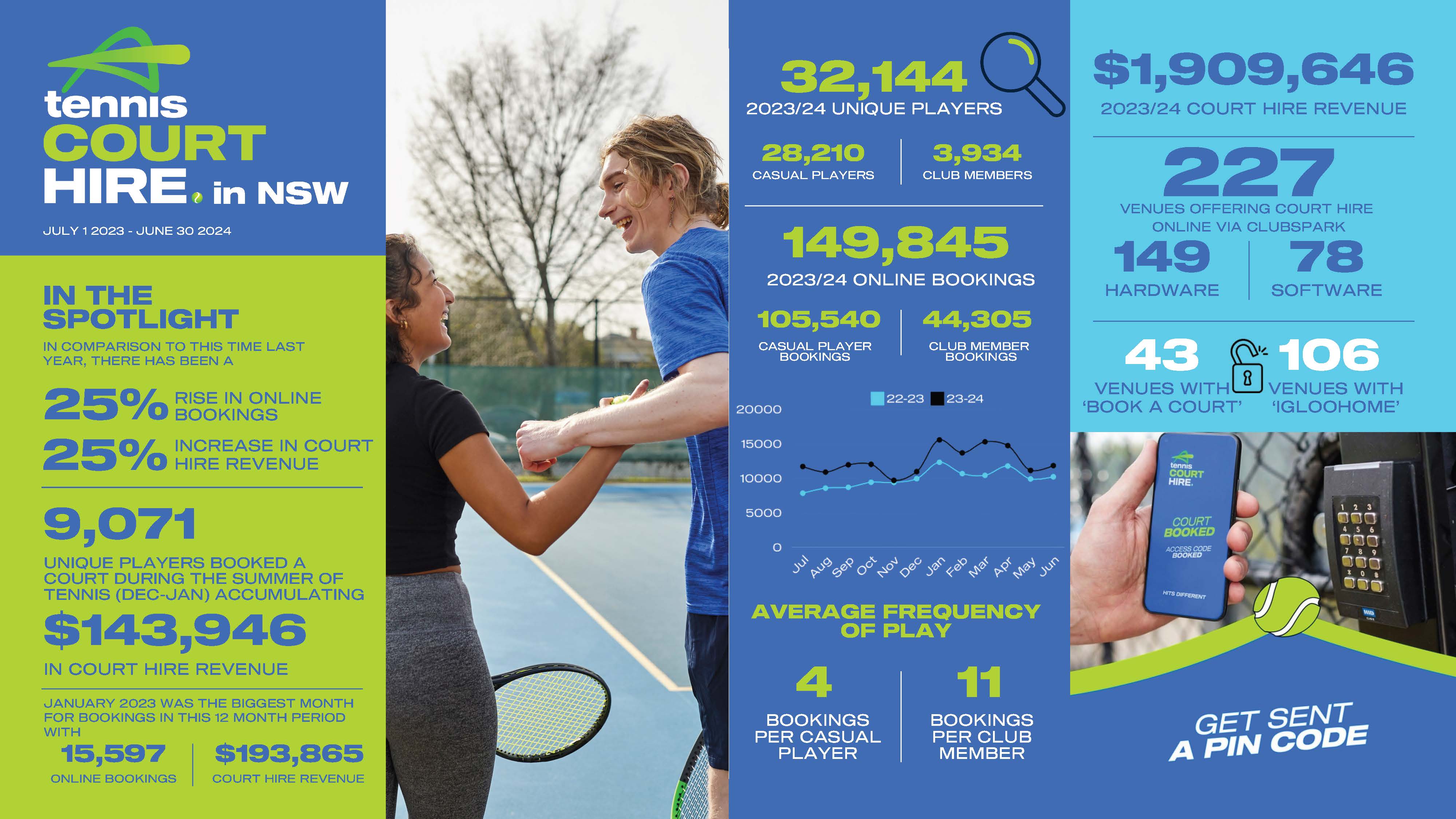 As a Tennis NSW member, you have access to a variety of digital products, including ClubSpark, Book a Court, Igloohome Locks and Barclay Lighting. These products ultimately assist with getting more people on court, whilst reducing the administration impact on you!
