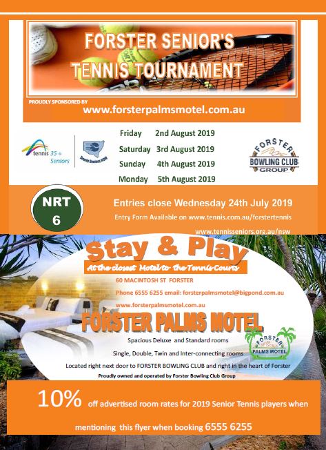 The Forster Senior’s Tennis Tournament will be held Friday 2nd August to Monday 5th August. Forster Tennis Club supports local businesses and restaurants offering discounts for tournament players.