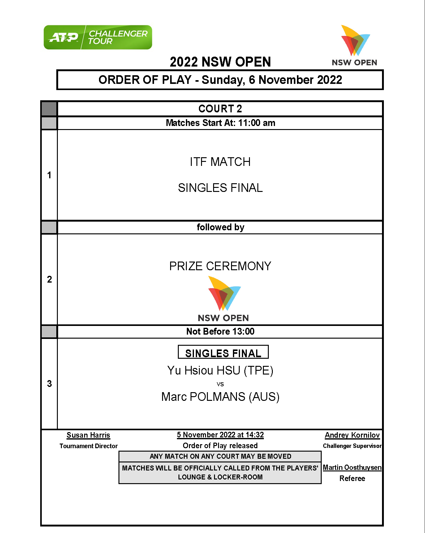 Men’s Semi Final action on court 2 also saw some great tennis played. Unfortunately our local hope in Max Purcell was defeated by Yu Hsiou Hsu (TPE) 6-1, 6-4, while Aussie Marc Polmans defeated Marek Gengal (CZE) 6-3, 6-4.