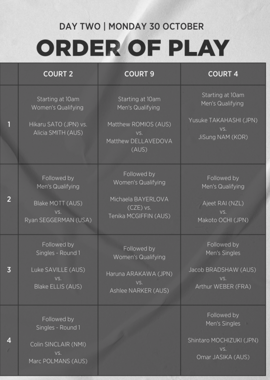 Day two will see the completion of men’s and women’s qualifying matches. Men’s main draw matches will also commence with Luke Saville, Marc Polmans and Blake Ellis beginning their campaign on Court 2.