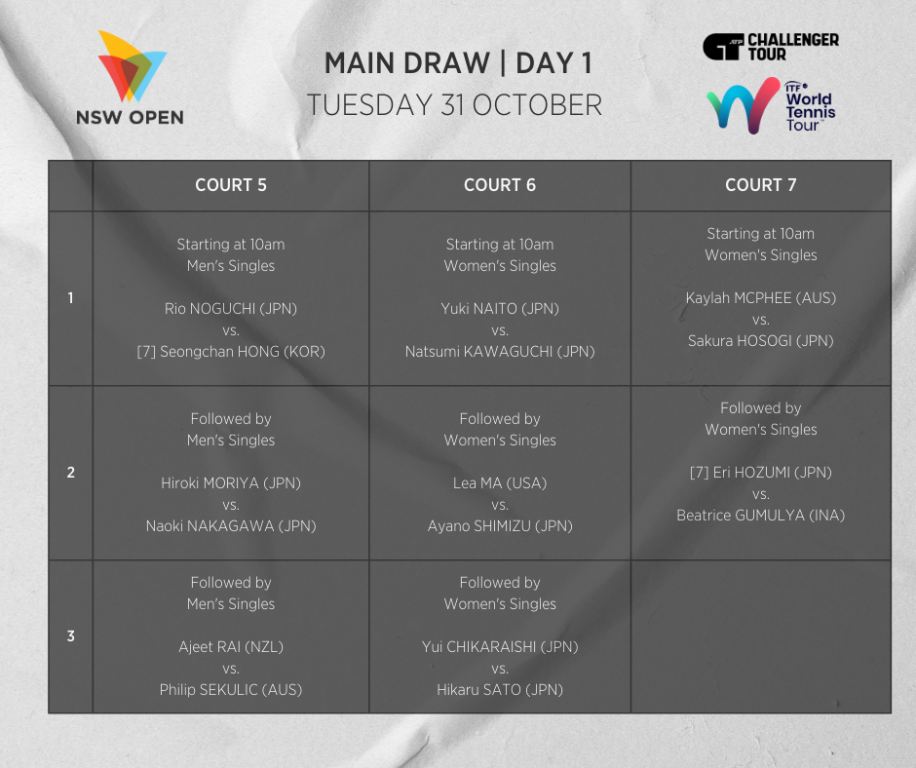 On court 9, Rinky Hijikata will play fellow Aussie Matthew Dellavedova. Following Hijikata’s match, Gabriella Da Silva-Fick returns home to Sydney to commence her campaign against the eight seed, Lanlana TARARUDEE (THA). Petra Hule (SA) and Jamie Fourlis (VIC) will also go head to head.