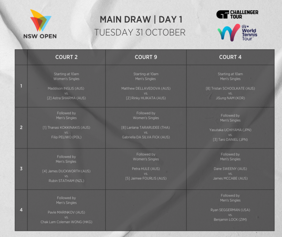 Tomorrow on Court 2, we have a star studded line up with the first match kicking off at 10am between Maddie Inglis and second seed Astra Sharma. Thanasi Kokkinakis will play second, followed by James Duckworth, before the day ends with up and coming NSW junior star, Pavle Marinkov.