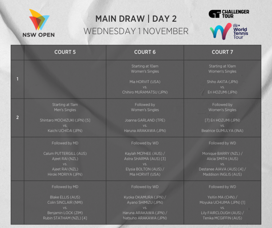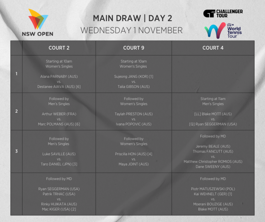 Day 4 kicks of with Destanee Aiava (VIC) up against Alana Parnaby (VIC) and Talia Gibson (WA) against the number 1 seed Sujeng Jang from South Korea. After James Duckworth (NSW) was forced to withdraw, lucky loser, Blake Mott (NSW) will return again tomorrow on court 4. Luke Saville (SA) will play the number 3 seed, Taro Daniel (JPN).