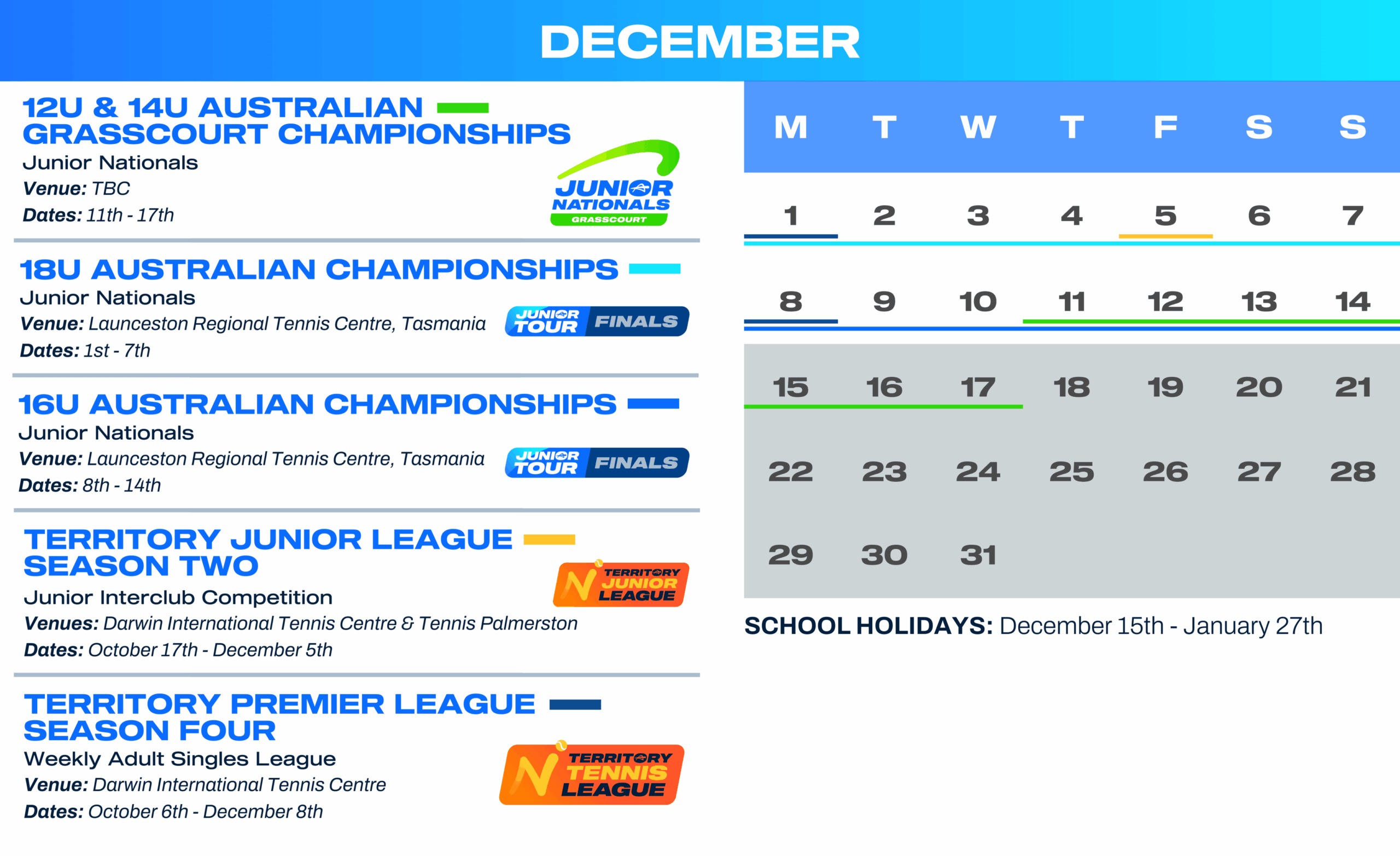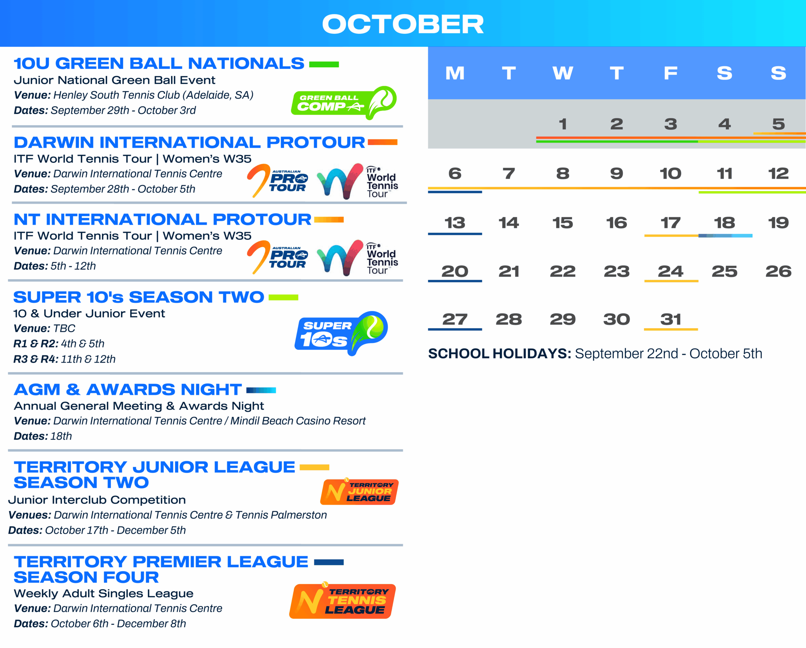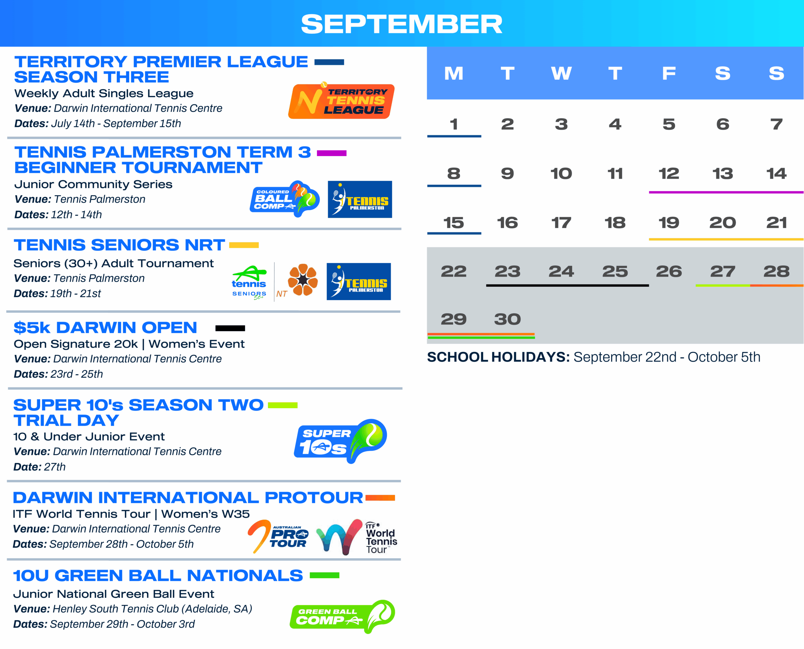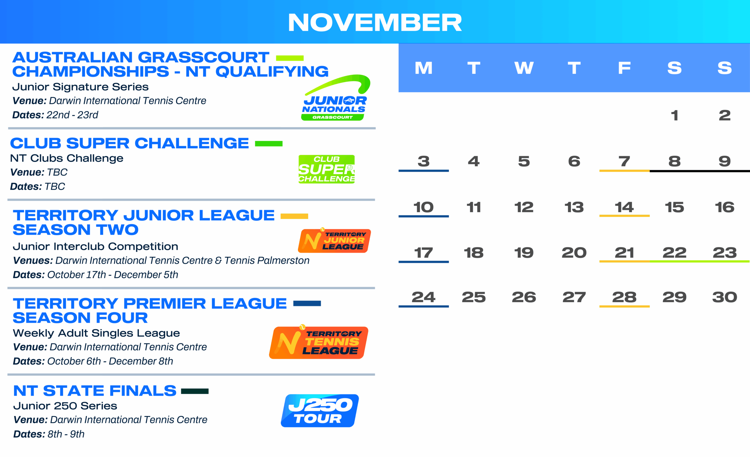 LIKE us on SOCIAL MEDIA – All of this information is on our Facebook Events Calendar, follow Tennis NT on Facebook and Instagram to keep up to date with all events.