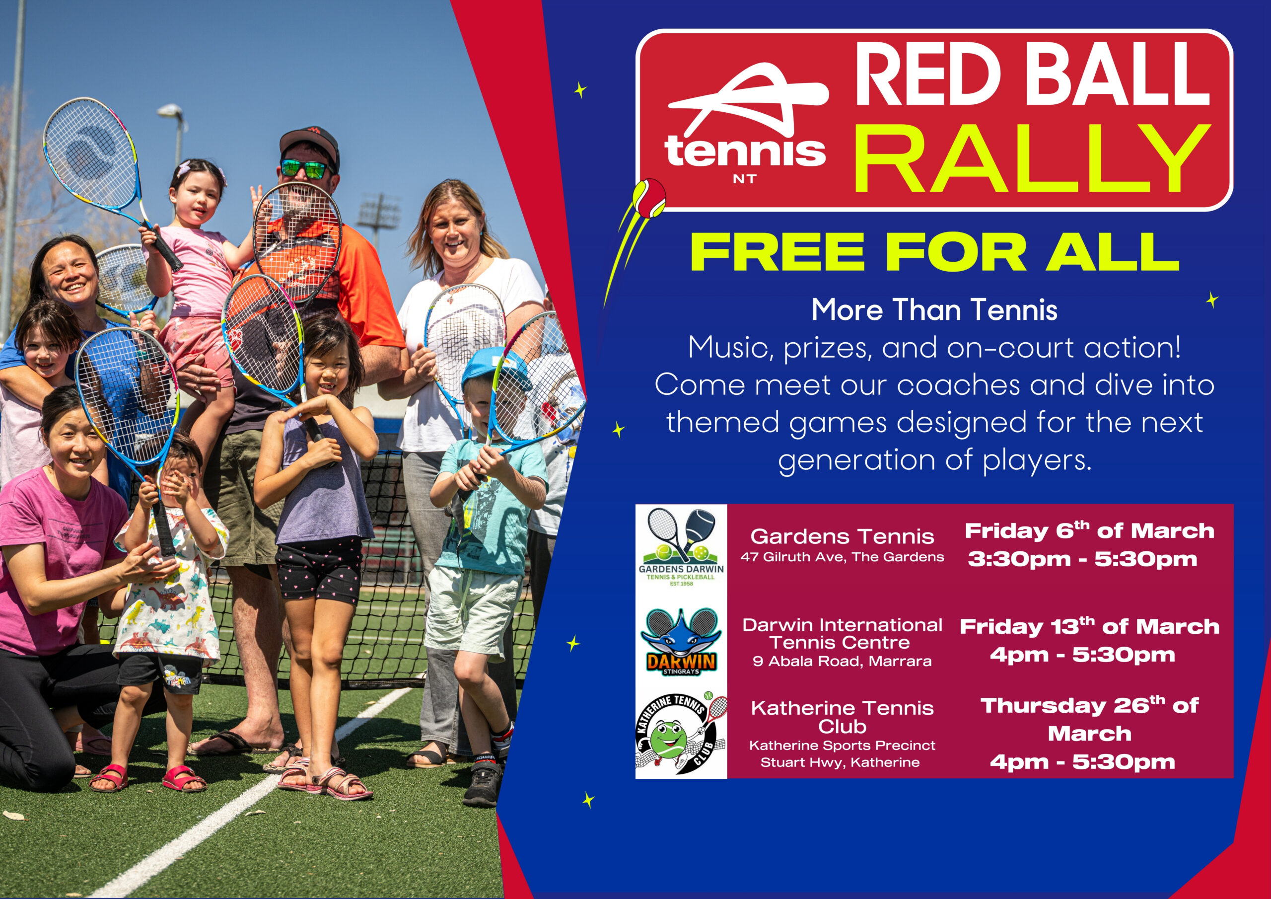The Red Ball Rally sessions are set to run across 3 of our clubs in the month of March: Gardens Tennis (near Darwin City), Darwin International Tennis Centre (Marrara) and Katherine Tennis Club.