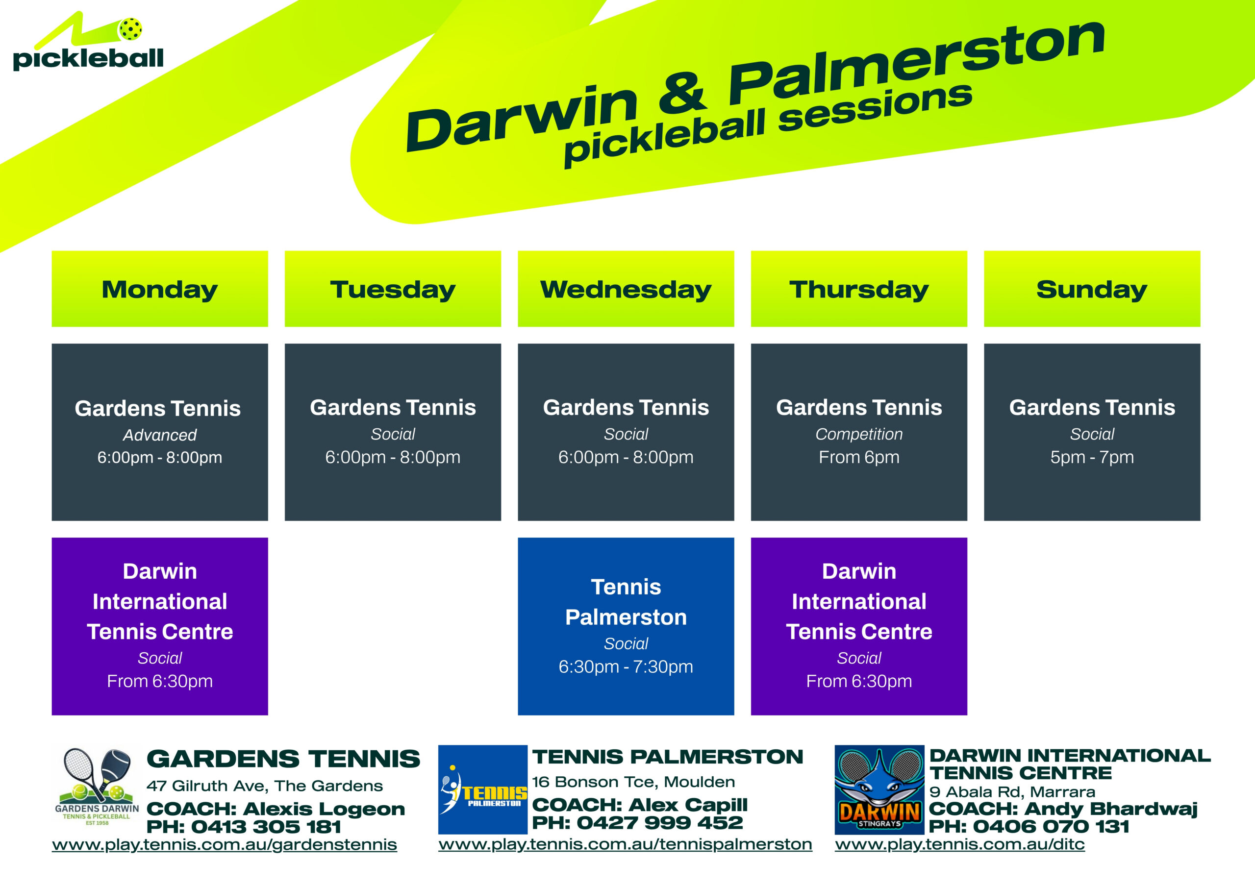 Every tennis club in the NT also offers Pickleball and most of the tennis coaches in the NT are also qualified to coach Pickleball.