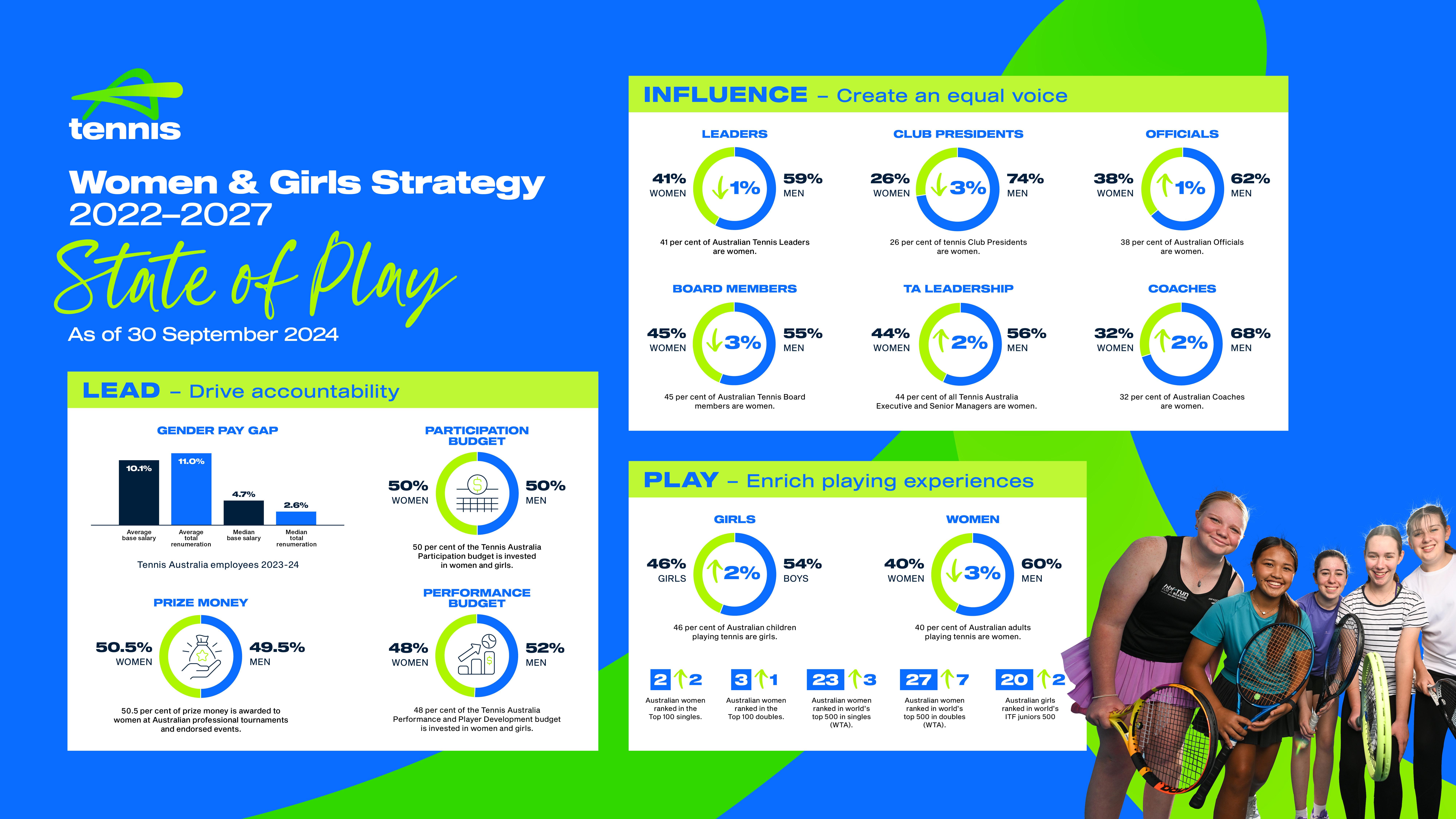 Tennis Australia is committed to creating a future where women and girls are equally valued, visible and included. The Women and Girls Strategy 2022–2027 sets out our five-year plan to address barriers and improve gender equality in tennis.