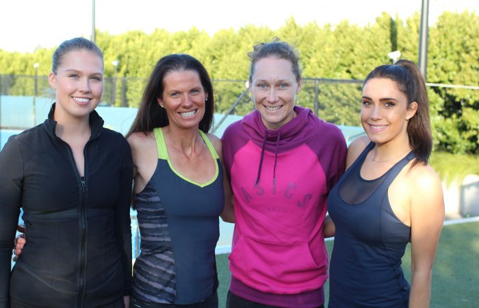 Sam Stosur with scholarship recipients (from left) Ellie Baxter, Maria Bailey, and Grace Primilyrlidis.