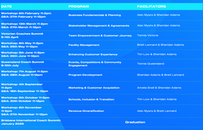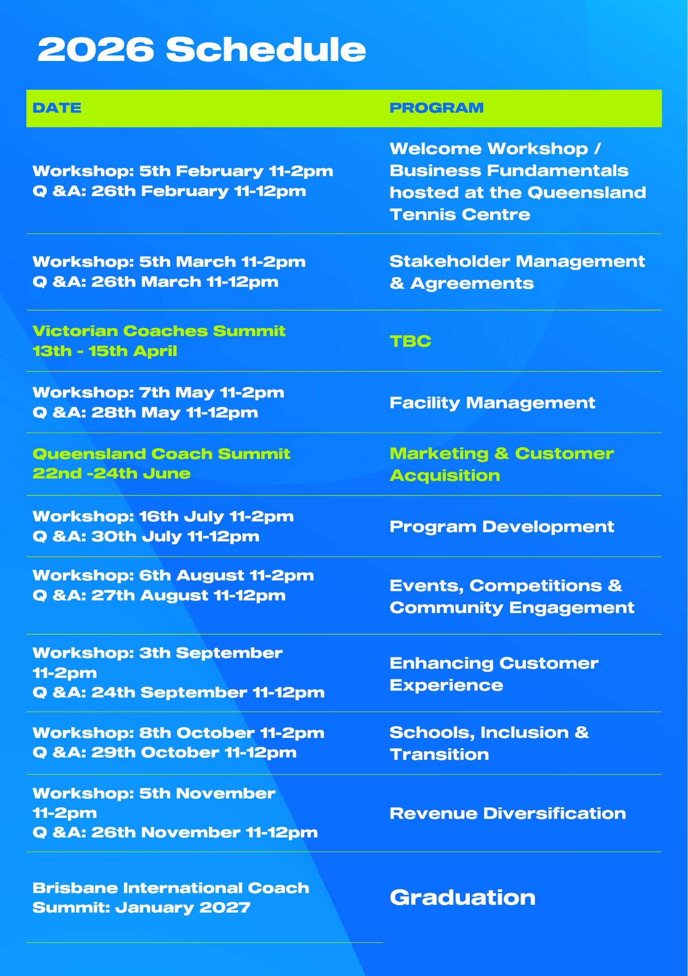 An innovative initiative exclusively for full-time aspiring Head Coaches and tennis centre operators within the state. This program provides coaches with a framework focused on business growth and professional development.