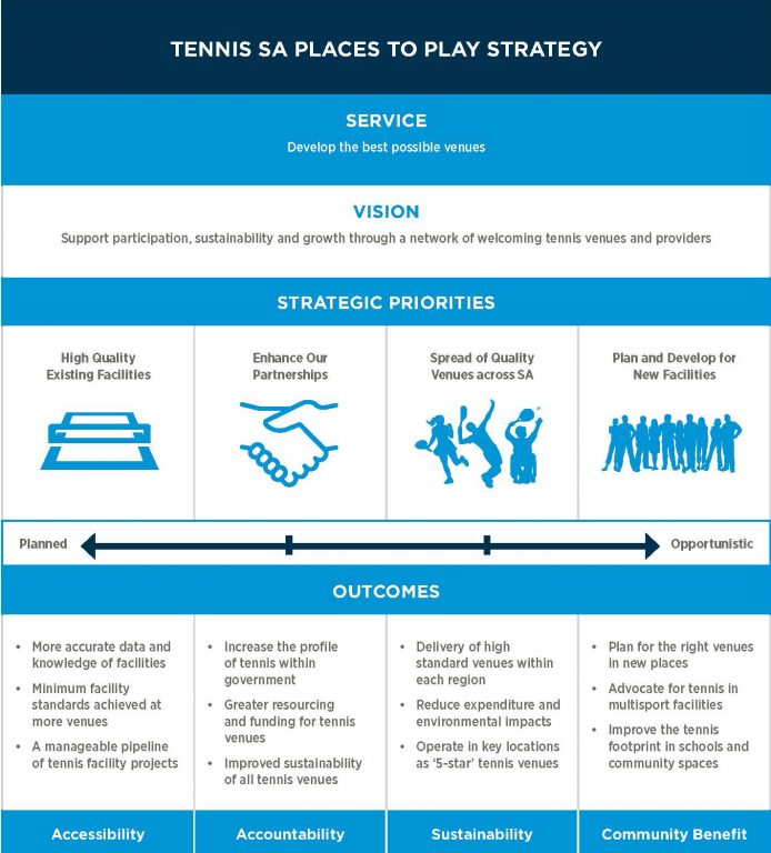 To be developed beyond the Tennis SA Places to Play Strategic Plan are the Tennis Australia Places to Play Framework and Tennis Australia Facility Guidelines and Standards, which will support specific projects.