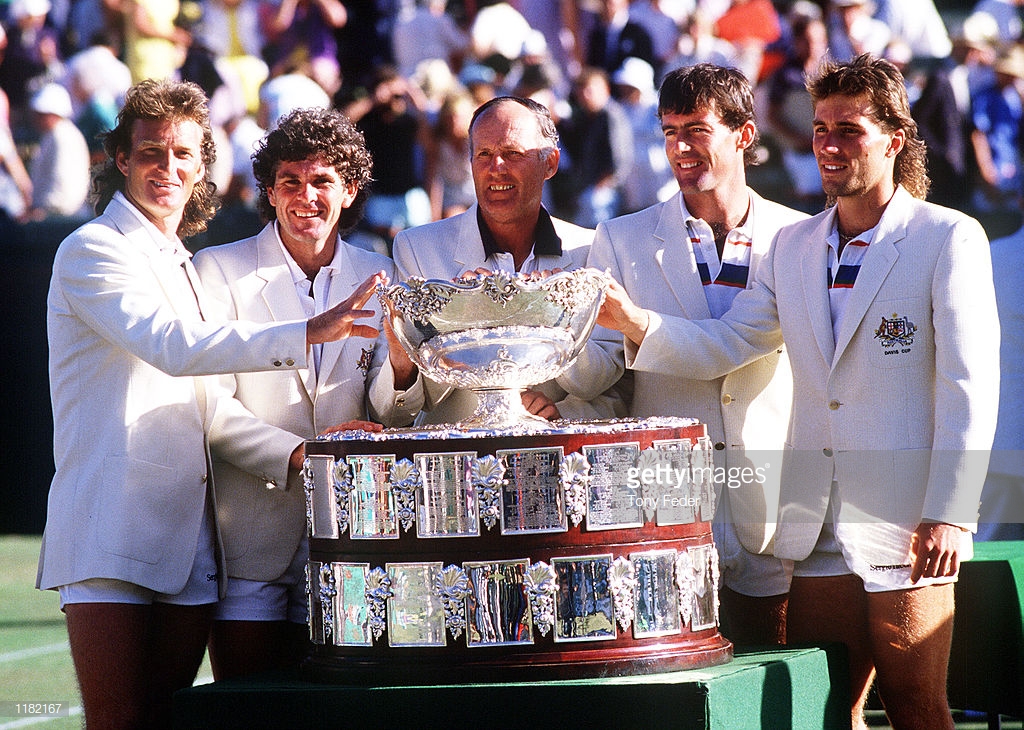 1986: (l-r) Peter McNamara, Paul McNamee, Neale Fraser (captain), John Fitzgerald and Patrick Cash of Australia celebrate victory with the Davis Cup, after the Davis Cup Final between Australia and Sweden at Kooyong, Melbourne, Australia. Australia defeated Sweden. Mandatory Credit: Tony Feder/ALLSPORT