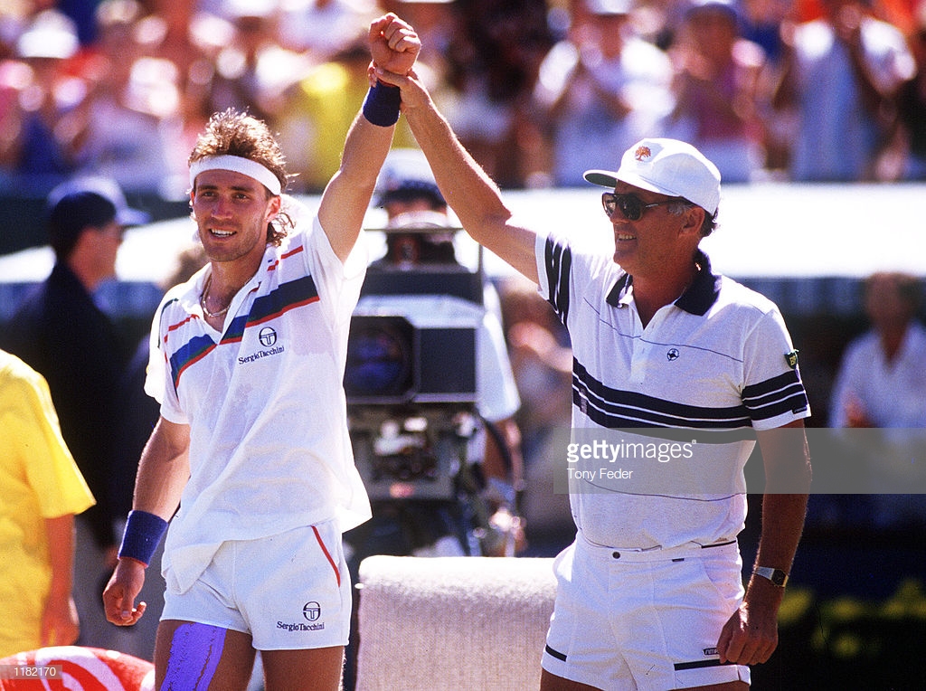 1986: Patrick Cash and Neale Fraser (captain) of Australia celebrate victory, after the Davis Cup Final between Australia and Sweden at Kooyong, Melbourne, Australia. Australia defeated Sweden. Mandatory Credit: Tony Feder/ALLSPORT