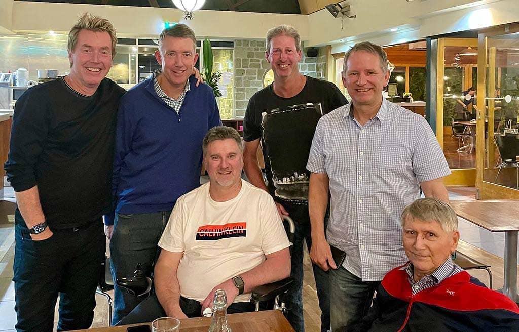 Former travelling companions Mark Woodforde, Richard Fricker, Mike Derer (sitting), Marty Richards and Gavin Pfitzner with Barry Phillips-Moore at a reunion at the Edinburgh Hotel in Adelaide.