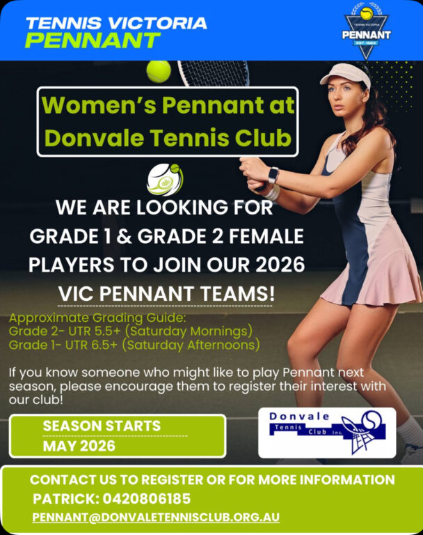 With a proud history spanning 60 years, Donvale Tennis Club is a friendly, inclusive club with a strong community spirit and excellent facilities. Located within the Donvale Reserve off Mitcham Road, Donvale, we boast 10 competition-grade en-tout-cas and synthetic clay courts (all with lighting) to cater for the competition and social tennis needs of all of our members all year round. For 2026, we’re excited to be growing our women’s competition tennis opportunities and are currently seeking female players interested in forming a Grade 1 and/or Grade 2 women’s Pennant team for the 2026 season. Whether you’re an experienced Pennant player or simply returning to competitive tennis, our club offers great support, competitive and social opportunities, and a welcoming team environment. Reach out to us to discuss how you can join us and be part of something special as we build for a strong Pennant season in 2026.