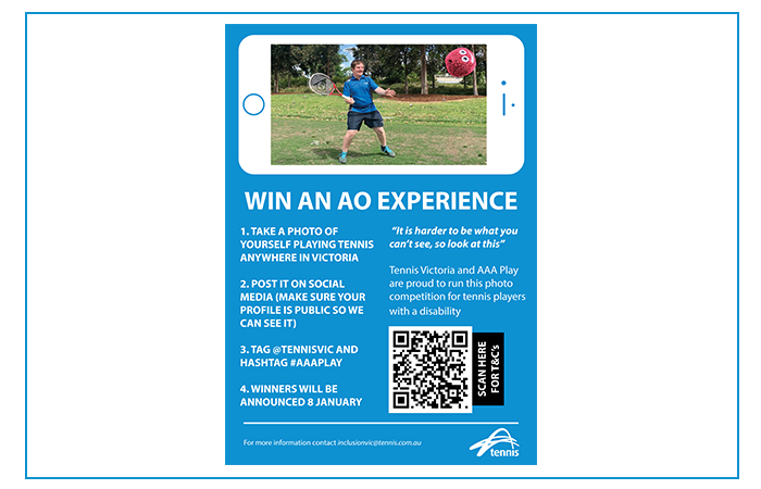 In conjunction with Sport & Recreation Victoria and Access for All Abilities (AAA) Play, Tennis Victoria is offering the chance to win an AO Experience for the person who uploads the best photo.
