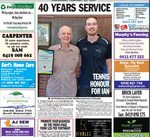 Ian was awarded his Tennis Service Award on February 11th in the South Camberwell Tennis Club rooms by Tennis Victoria’s Metro Inner East Club Development Officer, Kyle McMullan.