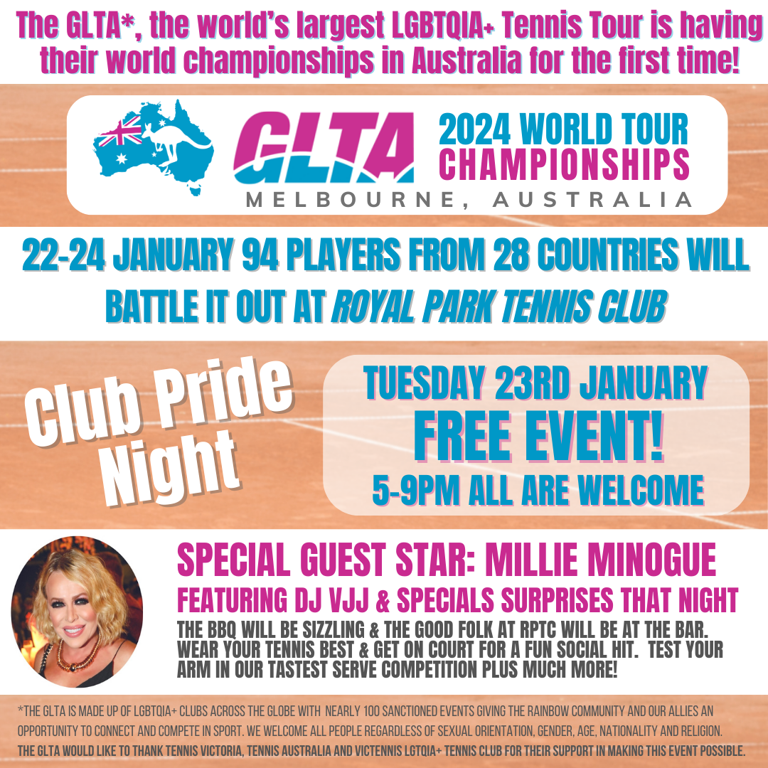 It’s free for spectators to attend and on Tuesday 23 January there is a Club Pride Night from 5-9pm where everyone is welcome. The night will include special guest star, Millie Minogue. Guests are encouraged to wear their tennis best, get on court for a fun social hit while enjoying DJ VJJ.
