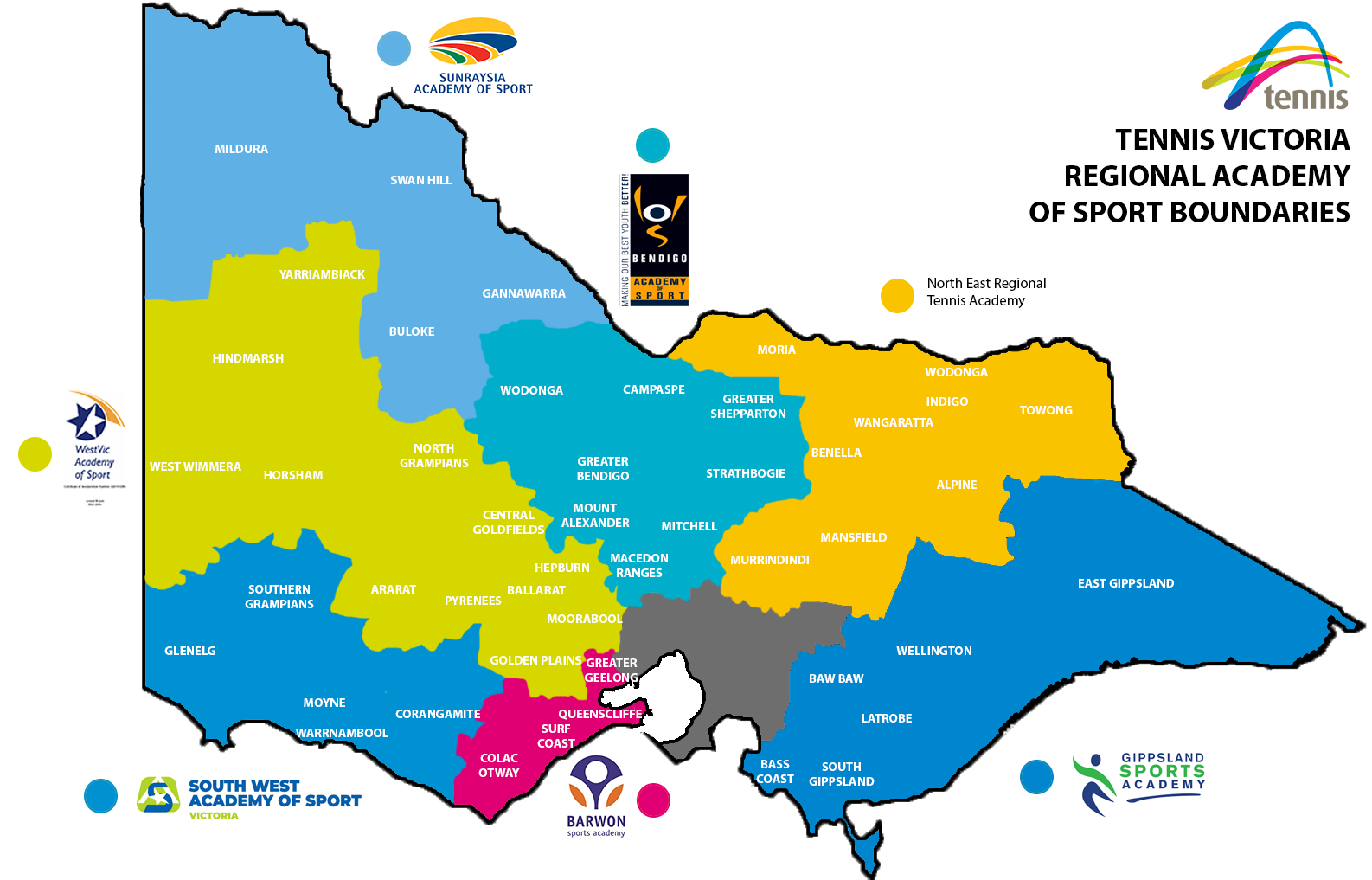 There are currently five Regional Academies of Sport in Victoria. They are Barwon, Bendigo, Gippsland, Southwest, and WestVic – please see below for Academy catchment areas and boundaries.