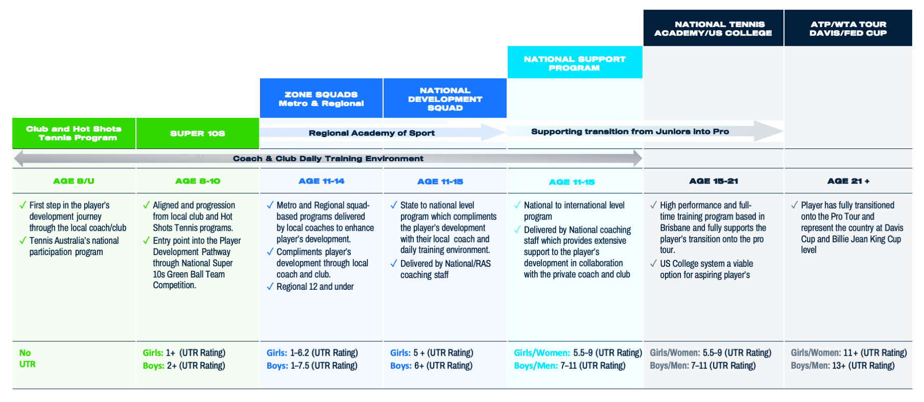 | Age 11 – 15 | National Development Squad | The National Development Squad is a performance training environment that is located at the National Tennis Centre. The program offers a comprehensive training structure for players who fulfill the entry selection guidelines based on player values, player performance and player potential. The National Development Squad continues to use a holistic approach to each player’s development by offering professional access to psychology, sports nutrition and sports medicine. The National Development Squad training and learning environment is underpinned with the core values of Competitive, Coachable and Committed.