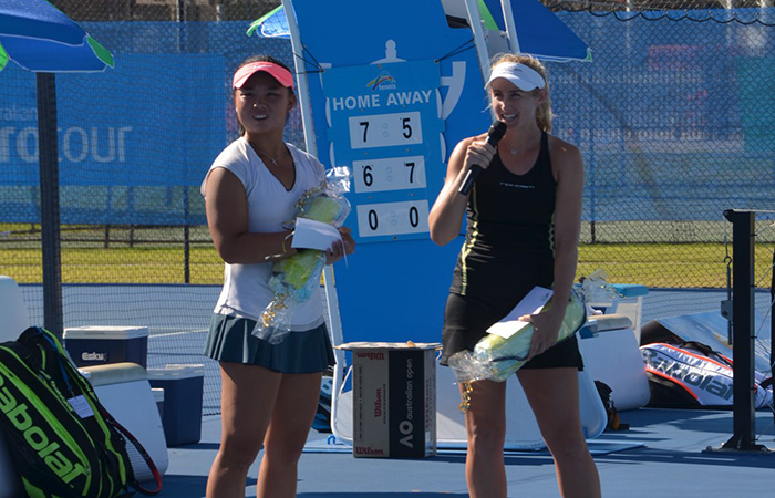 West Australian Jessica Moore (WA) delighted the home crowd by capturing the Perth Tennis International #2 doubles title with partner Olivia Tjandramulia (QLD), making it consecutive victories after claiming the Perth Tennis International #1 with partner Ellen Perez the previous week. Moore and Tjandramulia defeated Alison Bai (AUS) [4] and Jia-Jing LU (CHN) 7-5 6-7(8) [11-9].