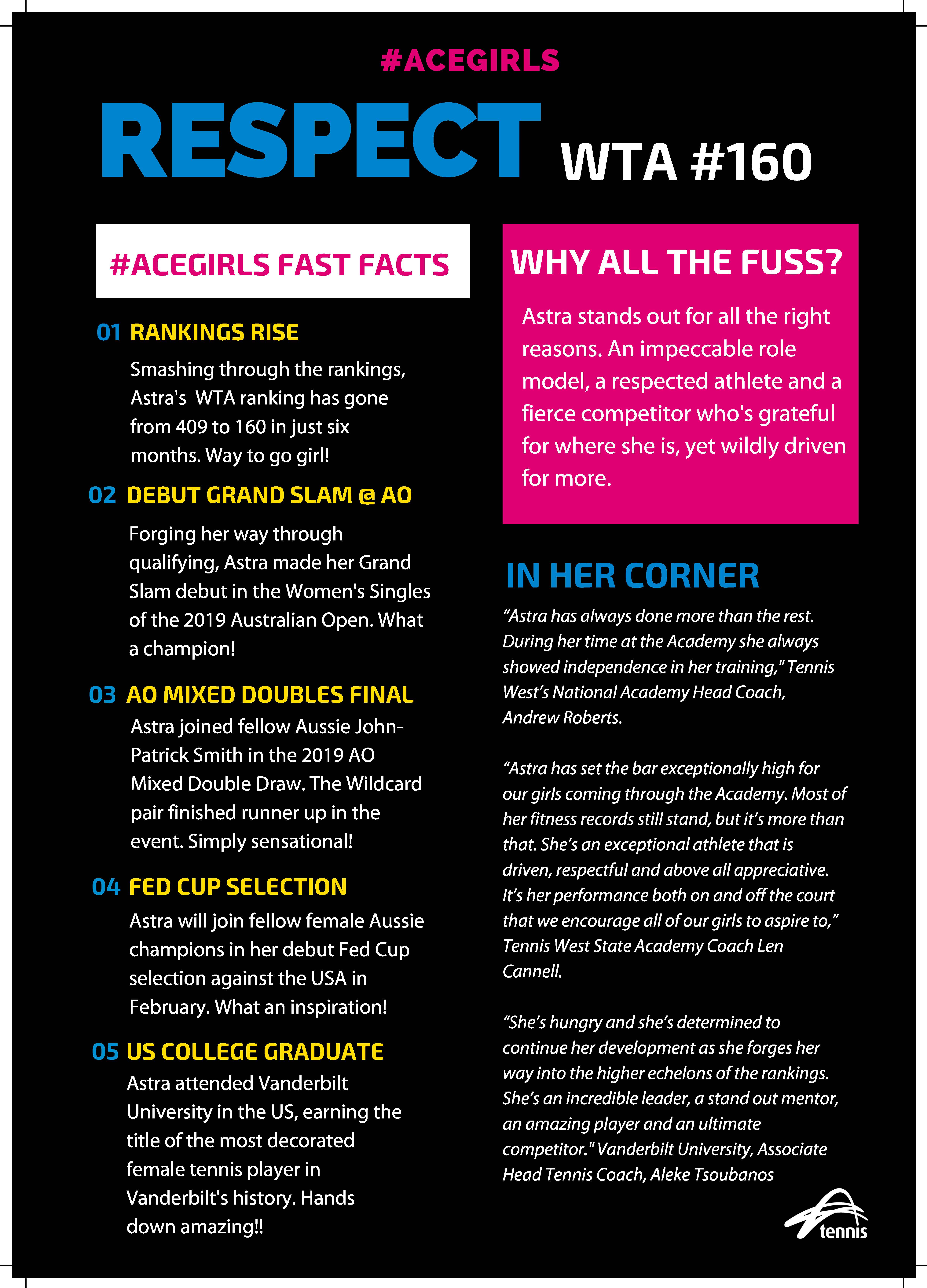 As such, it gives Tennis West great pleasure in announcing Astra Sharma as our inaugural ACEgirl. Coming off Astra’s impressive Australian Open campaign where she sliced her WTA ranking from 230 to 160, the decision was simple.