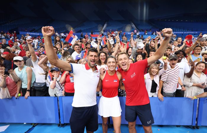 January 2: Novak Djokovic (SRB), Olga Danilovic (SRB) and Hamad Medjedovic (SRB) with fans after the Mixed Doubles, on RAC Arena during the 2024 United Cup in Perth, on Tuesday, January 2, 2024. Photo by TENNIS AUSTRALIA/ ALEX COPPEL