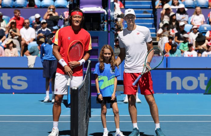 January 3: Coin toss before the game. Zhizhen Zhang (CHN) plays Hubert Hurkacz (POL) on RAC Arena during the 2024 United Cup in Perth, on Wednesday, January 3, 2024. Photo by TENNIS AUSTRALIA/ ALEX COPPEL