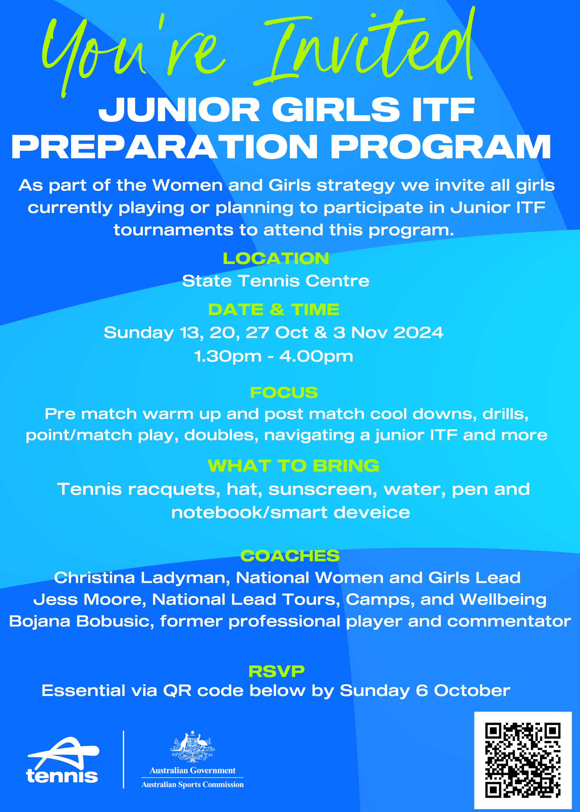 The sessions will be held at the State Tennis Centre on Sunday afternoons from 1:30 PM to 4:00 PM, starting on October 13. Each session runs for 2.5 hours. The program is open to all girls currently playing or planning to participate in Junior ITF tournaments. We recommend discussing your participation with your private coach.