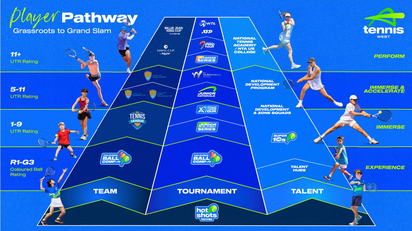 Tennis Australia has developed the Training and Competition Pathway to set players on the path to becoming a professional. The pathway maps players’ evolvement from the time they first pick up a racquet to when they join the ATP/WTA Tour.